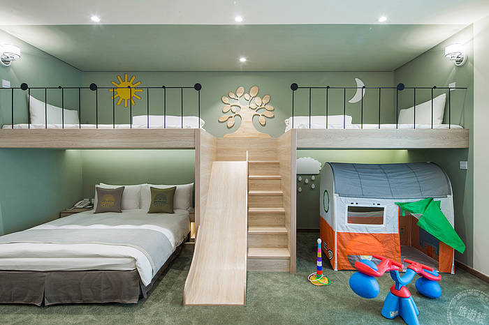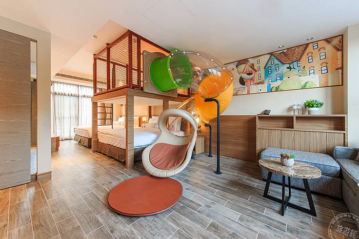 To satisfy the demand of family traveling, a lot of hotels in hospitality industry provide theme guest rooms beloved by parent-child families, including: Silks Place Yilan - 5-star car theme hotel for kids, with Fantasy Castle theme facilities on floor 8 and 9; HOTEL COZZI XIMEN TAINAN - cooperates with Cartoon Network to create the only cartoon channel theme in Taiwan; CHATEAU DE CHINE hualien - provides rooms with theme inspired by Jimmy's picture books; Sun Dialogue Hotel and Grand Cosmos Resort - equipped with slides in each parent-child rooms.