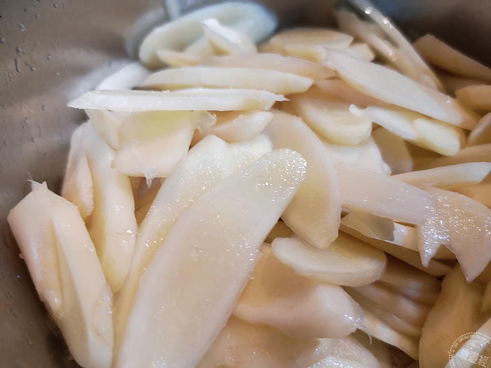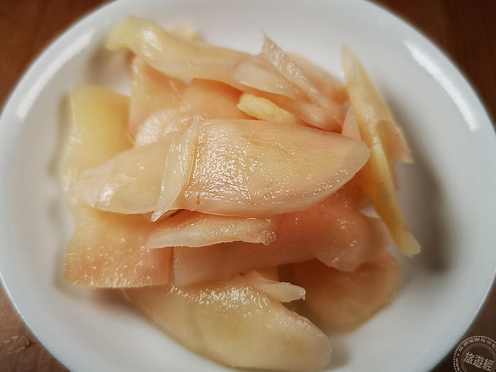 二、切片,若要快吃可以斜切,薄厚可以看個人喜好,若要略有口感,每片可以0.15-0.2公分左右,若只是要薑味可以更薄些。另外,也可以用撕的或是切塊!